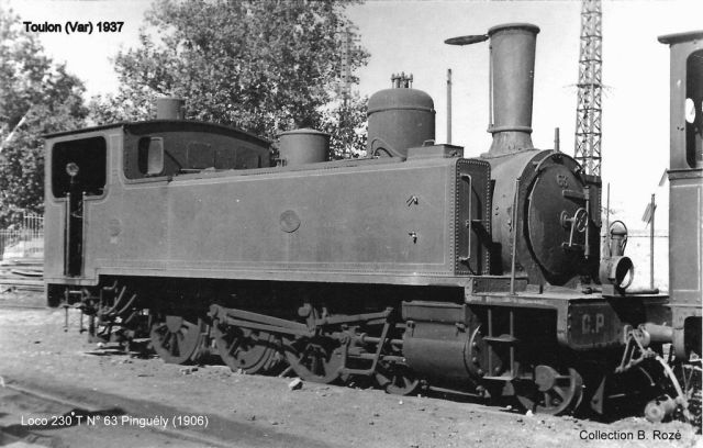 Photo coll. Bernard Rozé - La 230 T N° 63 stationne sur la voie en impasse N°3 de la gare de Toulon afin de refaire le plein de briquettes de charbon. |