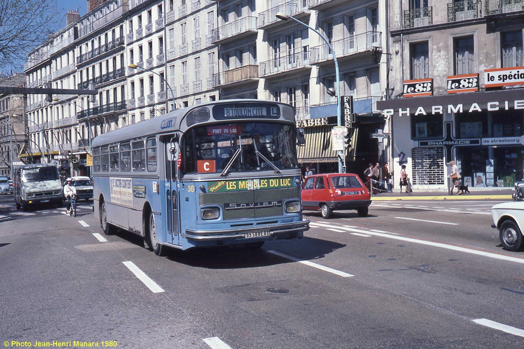 Ci-dessus à gauche, photographié en 1980, ce Saviem S53 porte le N° de parc 33, il arrive ici place Noël Blache. Remarquer l'apparition du logo SITCAT au-dessus de la porte avant. Ci-dessus à droite, même endroit et même date de prise de vue pour le N°36. Un petit détail :son numéro d'immatriculation, 9958 RE 83 suit celui du bus pris en photo sur le tournage du film "Le jeune marié" |