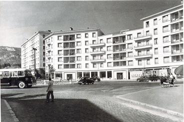 Berliet PR 100 MI à la carrosserie étincelante, photographié ici en 1980, il quitte le rond-point Noël Blache; on voit le collège Peiresc