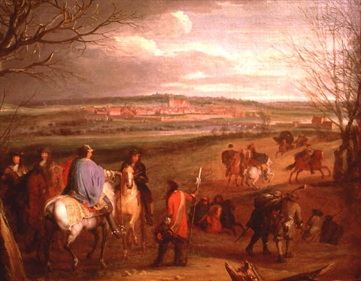 Adam Frans van der Meulen : peintre paysagiste d'origine flamande né en 1632 à Bruxelles, mort à Paris en 1690. Il est appelé en 1664 au service du Roi Louis XIV : le suivant dans de nombreuses campagnes militaires, il réalise la série des "Conquêtes du Roi", suite de quatorze compositions destinées au décor du château de Marly. La plus grande partie de ces toiles est conservée au Louvre. Ce tableau illustre un genre crée par van der Meulen lui-même: la peinture de conquête.