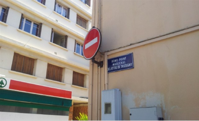 | Photo Yohan Keller - Le rond-point Maréchal de Lattre de Tassigny inauguré en 1952 n'existe plus dans les faits mais la pancarte est toujours là ! Derrière, on aperçoit l'épicerie SPAR. |